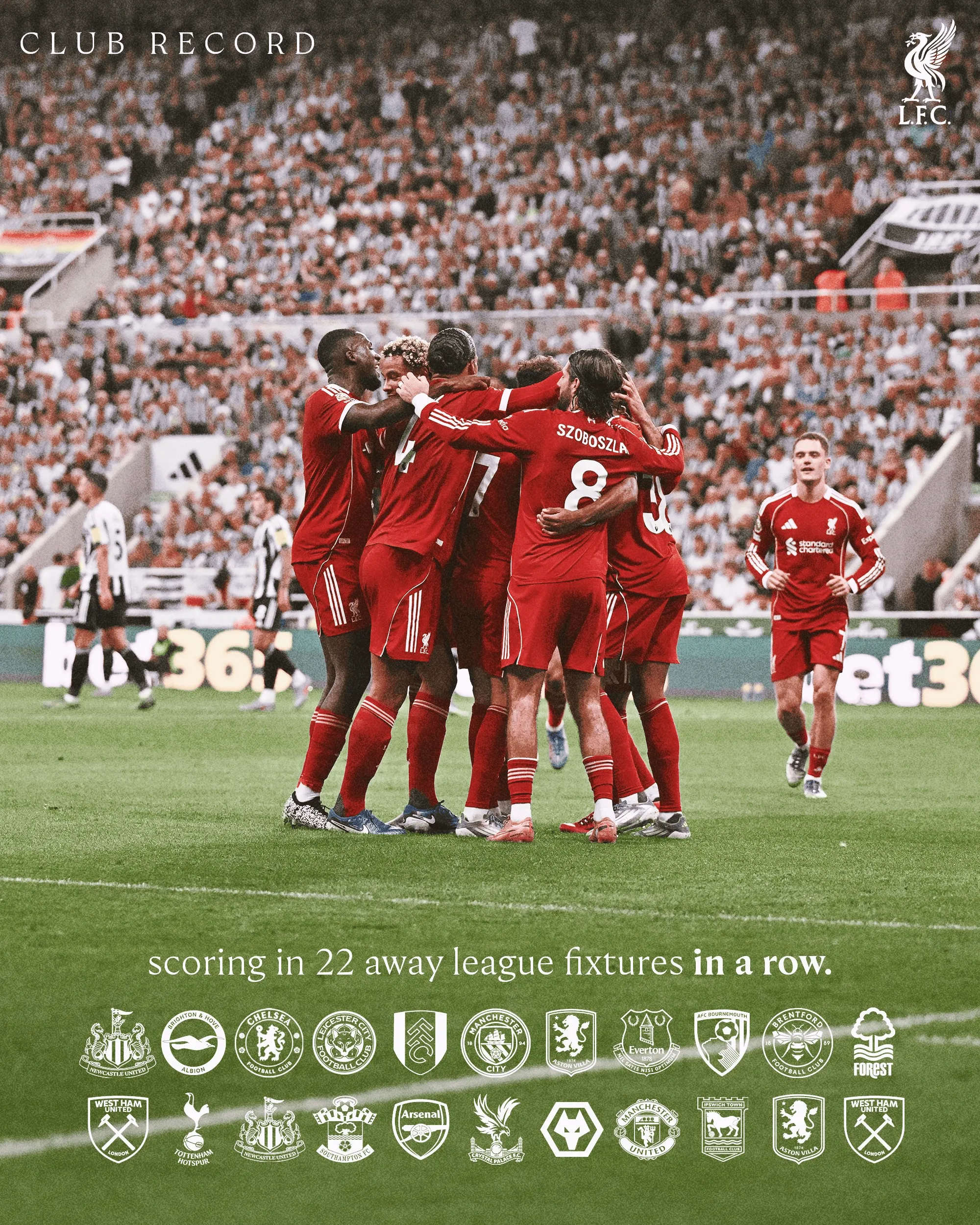至此,利物浦已经连续22个英超客场比赛取得进球。